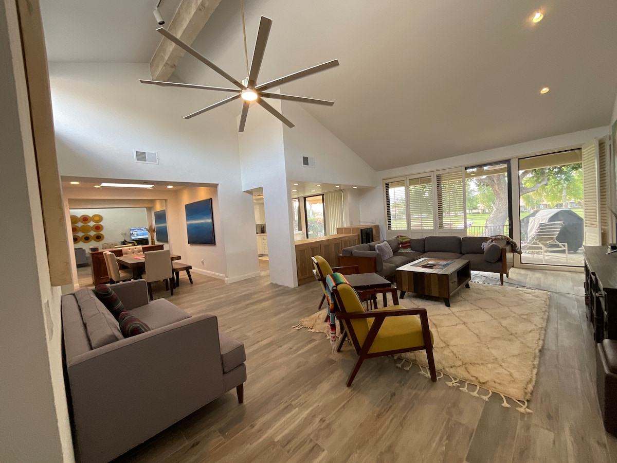 Licença STVR de Cathedral City nº 018614. Piscina e spa privativos. Casa de férias relaxante, bonita e tranquila no Desert Princess Country Club. Espaçoso layout de 153 metros quadrados no campo de golfe @ 2ª tee. Moderno e espaçoso 3 quartos 2,5 banheiros, 2 quartos principais com camas king +3º quarto com cama king dupla vista para a montanha privada e aberta para o campo de golfe. Garagem grande para 2 carros com mesa de bilhar de tamanho completo A 2,4 km de Palm Springs. Condomínio fechado, segurança 24h Não é uma casa de festas Não é permitido barulho alto ao ar livre