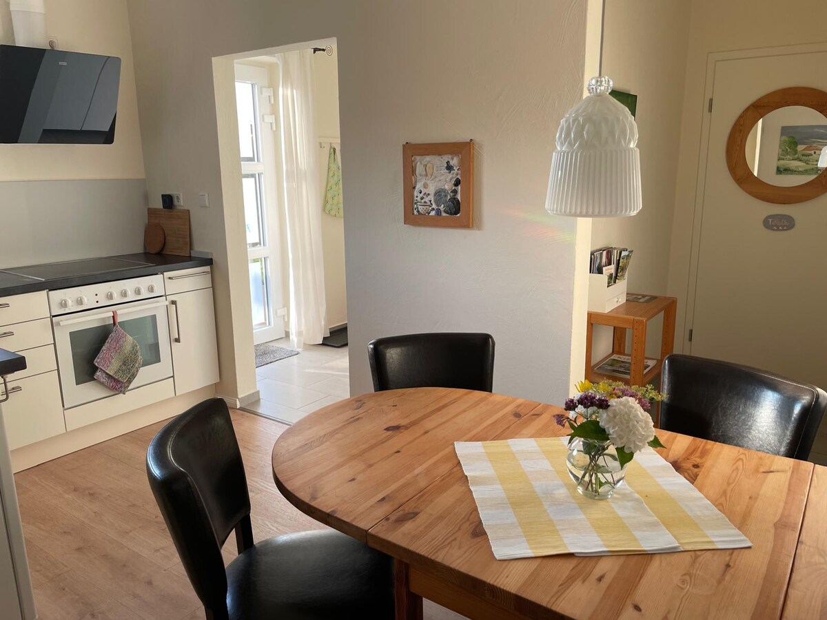 Bem-vindo ao nosso apartamento de férias com jardim próprio. O apartamento fica no andar superior e é acessado por escada compartilhada. Há uma sala de estar/cama/trabalho com uma cama queen size (1,4 x 2 m) e outro quarto com duas camas. Banheiro com chuveiro/banheira e cozinha totalmente equipada. Uma loja de fazenda e um restaurante estão a uma curta distância a pé. Instalações comerciais, esportes turísticos e estação podem ser alcançados em 5 minutos de carro.