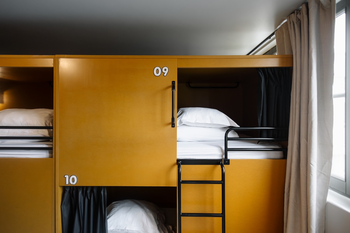 Quarto com dormitório acessível, mas elegante e funcional, com capacidade para 6 pessoas. Camas confortáveis com roupa de cama e toalhas incluídas para garantir uma boa noite de sono. Perfeito para grupos grandes ou para viajantes individuais com orçamento limitado. Este quarto é reservado com base na cama por cama.