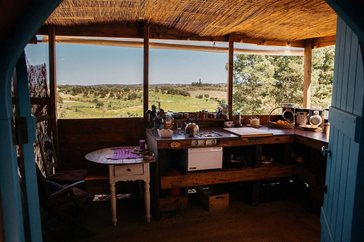 Welcome to Quinta Carapeto ! You will sleep in a very unique transformed oval pig shed with a reciprocal roof and glass top window for star gazing and amazing views into the garden. It's equipped with a little kitchenette, with a two flame gas cooker and small fridge. It has a double bed 1,40x2,00m. Optional we have a camping bed if you wanna come with one child. Also There is a big outdoor bathhouse with warm water. Our place is at a 1,5km off-road track suitable for normal cars.
