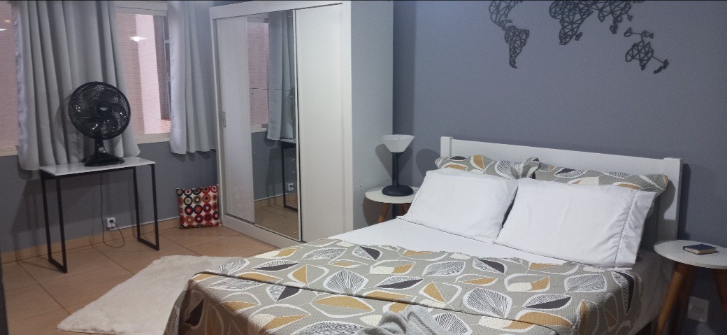 O ap é um STUDIO (pequeno)bonito e aconchegante mobiliado com vários itens pra vc ficar vários dias,o colchão é de espuma e bem firme, a TV contém vários canais esportivos, filmes etc. EU mesmo faço a limpeza do AP (Dentro do Prédio possui um mercadinho com vários intens de bebida e comida para facilitar a vida do hóspede)o prédio é calmo, tranquilo e Fácil acesso! check in pode ser feito na portaria ou comigo, prédio perto de 2 shoppings,bares,Fatesa,Unip, pizzaria, posto de gasolina..