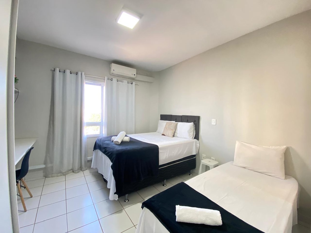 Se você procura um lugar funcional e aconchegante, este apartamento vai te surpreender! Wi-fi de ótima velocidade, ar condicionado nos quartos e na sala! Dois quartos, um com cama Queen, outro com 2 camas de solteiro, criado mudo móvel (permitindo que seja retirado, caso haja necessidade de unir as duas camas), armários planejados. Sala com cadeiras confortáveis, cafeteira, cozinha com todos utensílios necessários para preparar suas refeições. Máquina de lavar roupas e tanque. Sinta-se em casa!