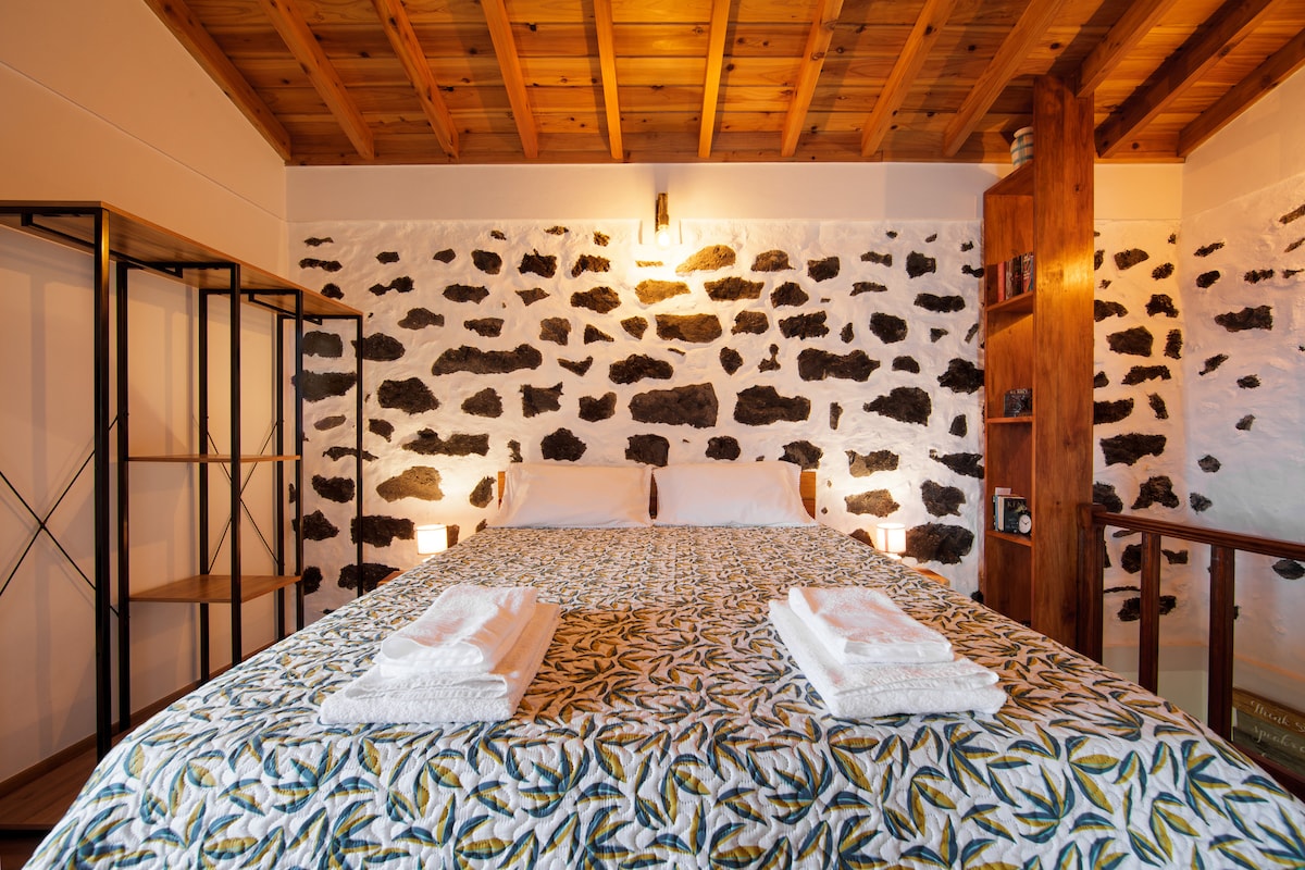 Quer uma casa de pedra, rústica, mas de ambiente e interior moderno, confortável, romântica, ideal para dois, com vistas deslumbrantes? Está no local certo, é aqui. Em frente, um deckcom cadeiras loungee um churrasco de pedra, a vista total da ilha de São Jorge e do canal, de suster a respiração. Do seu lado esquerdo, o recorte das baías das freguesias de São Roque, Praínha e Santo Amaro do Pico, ondas a bater e pássaros esvoaçantes; um por do sol de apaixonar. A sala tem vidros do teto ao chão em portas deslizantes que abrem o interior ao exterior e às vistas descritas. Esta casa faz parte de um pequeno resort familiar, dentro do qual está disponível o restaurante Magma, uma mercearia, uma sala de yoga e uma piscina aquecida. De que espera para vir para este paraíso?