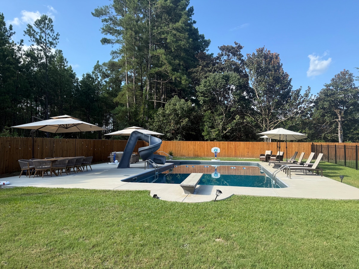The ultimate getaway! 3 mi. from Pinehurst Country Club & close to So. Pines. Enjoy a relaxing & fun stay in a newly built home. This spacious home has 4 bd rooms, 3 baths, sofa sleeper,Kit./dinning/living rm, laundry. The sun rm has a Sauna & foosball table. Outside you can swim in the large pool, grill & relax in the lounge area with sofa, dinette and unwind in the Spa. The yard is fully fenced in by a 6 ft. Privacy fence. There is also a grill,swing set,trampoline, fire pit and chairs.