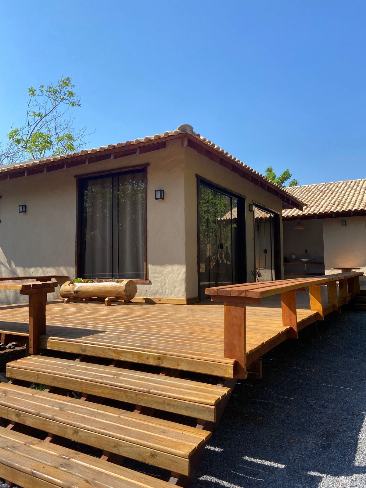 Linda casa em estilo rústico e bem perto da natureza. Deck de madeira em torno de toda a casa. Possui dois quartos com ar condicionado, cada um com uma cama de casal e treliche . Que acomodam 10 pessoas. Área Gourmet com ar condicionado, fogão geladeira. Churrasqueira e forno a lenha para pão e pizza. Mesa de jantar, sofá cama e tv. Utilizando o sofá cama da sala acomoda até 11 pessoas no total. Lavabo na parte externa e lavanderia com máquina. Quintal todo telado e localização tranquila.