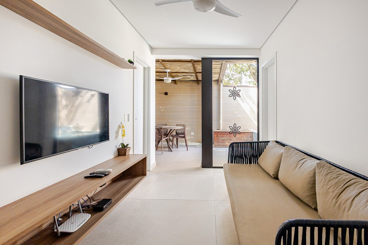 Casa aconchegante, confortável, silenciosa, arejada, luz natural, equipada, ar-cond., churrasq., TV a cabo, Wifi, Lavaseca, Lavalouça e 2 vagas. Condomínio: arborizado, bem localizado e seguro, 50 mts da praia, serviço praia (cadeiras e barraca), zelador e piscina. Serviço de empregada incluso, limpeza básica e arrumação de camas. Não esta incluso limpeza de louça. A pé: centrinho; Shoppings; restaurantes; bares; mercado e farmácia.