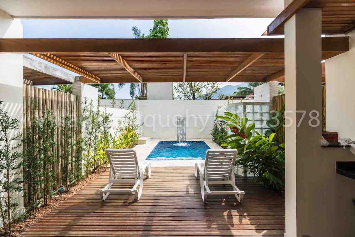 Casa de alto padrão em Juquehy, São Sebastião em condomínio fechado com 4 casas. 500 metros da praia. 3 suítes todas com ar-condicionado, churrasqueira e piscina privativa. Casa toda equipada na cozinha e churrasqueira, incluindo carrinho de praia com Guarda Sol, cadeiras de praia e cooler. Temos serviço de praia incluso. A casa está adaptada para home office com 3 estações de trabalho nos quartos e uma bancada para 3 pessoas no andar inferior com tomadas. Wi-fi com 3 roteadores nos 2 andares.
