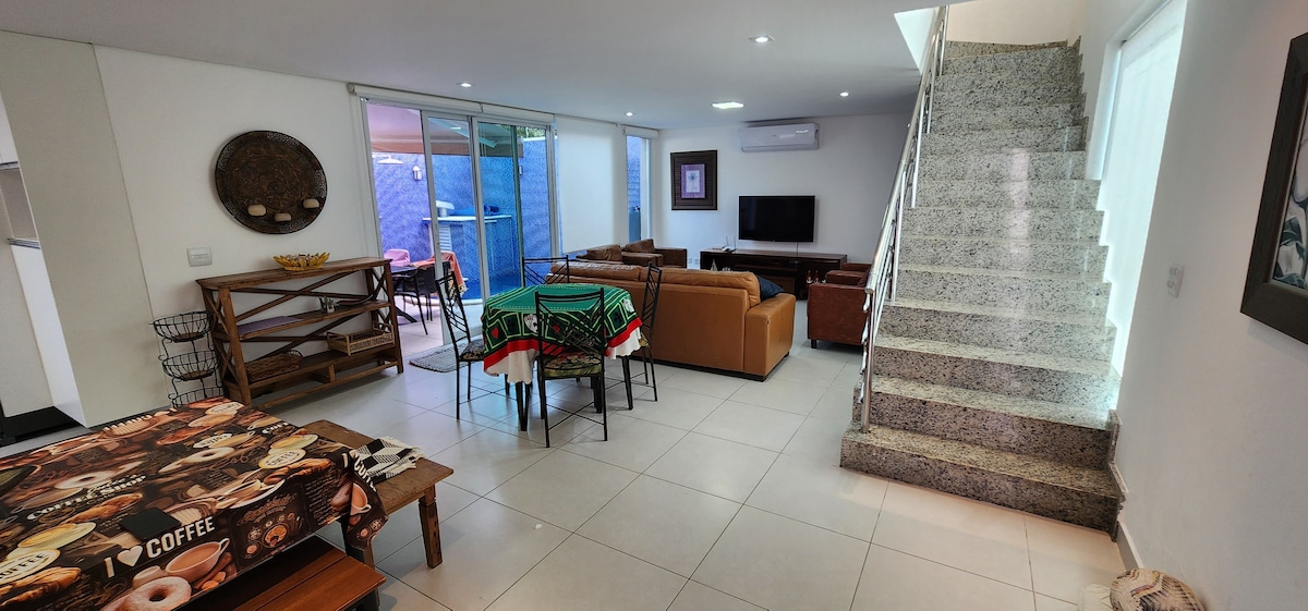 Excelente localização em condomínio fechado bem tranquilo, 500m da praia e ao lado do centro comercial. Nossa casa possui 3 dorms com ar condicionado e ventiladores de teto. A cozinha está totalmente equipada com cafeteira Nespresso, para aqueles que amam cozinhar, com acesso direto à área de churrasqueira privativa. Sala com smart TV 50”, WI-FI fibra ótica. Cadeiras de Praia. Condomínio fechado com piscina e segurança automatizada. 1 vaga garagem. Estadias superior 7ddl, poderemos conversar.