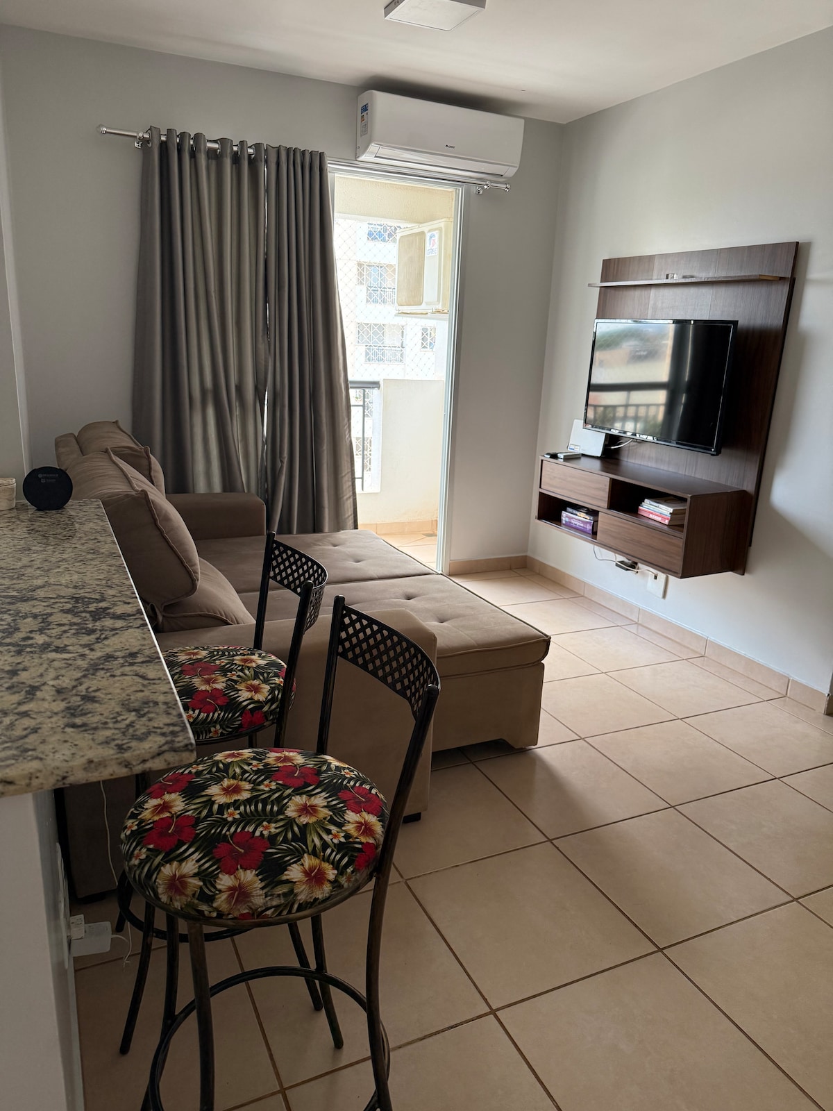 🏡 Apartamento charmoso em Rio Verde Apartamento charmoso em Rio Verde, em condomínio seguro e silencioso com portaria 24h. Possui 2 vagas cobertas, ar-condicionado nos quartos e sala, 2 banheiros, Wi-Fi rápido e TVs com Netflix, YouTube. Cozinha completa com adega de vinho, geladeira espaçosa, micro-ondas e cafeteira. Varanda estendida com tela protetora. Condomínio oferece salão de festas, churrasqueira e quadra futebol. Salão de festa Localização privilegiada, próximo lazer, comer e lazer