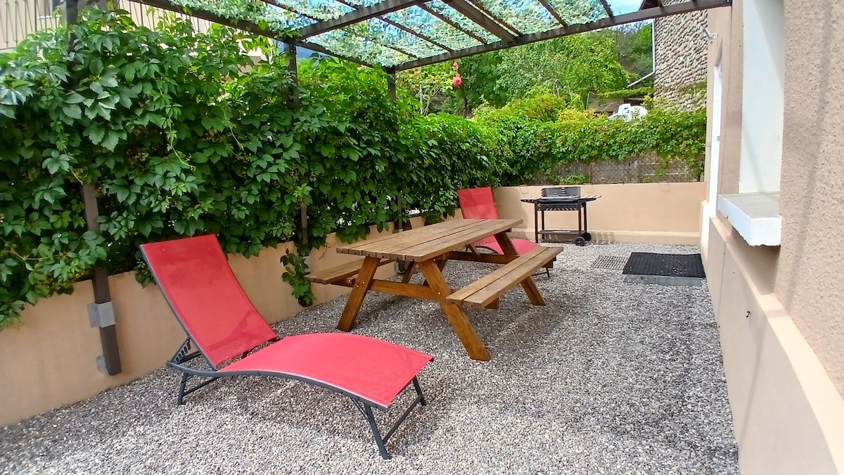 Belo apartamento de 2 quartos… 3 ⭐️⭐️⭐️ no térreo de uma vila. Amplo terraço com móveis de jardim, banheira de hidromassagem para 6 pessoas e churrasqueira. Propriedade cercada e fechada. Vistas deslumbrantes do lago e das montanhas, perto de uma escalada, floresta e muitas caminhadas. A casa tranquila e autêntica recebe você em uma atmosfera suave, limpa e acolhedora. Aqui, a simplicidade rima com serenidade... A decoração, cuidadosamente pensada, mistura materiais naturais, tons suaves e objetos escolhidos com o coração...