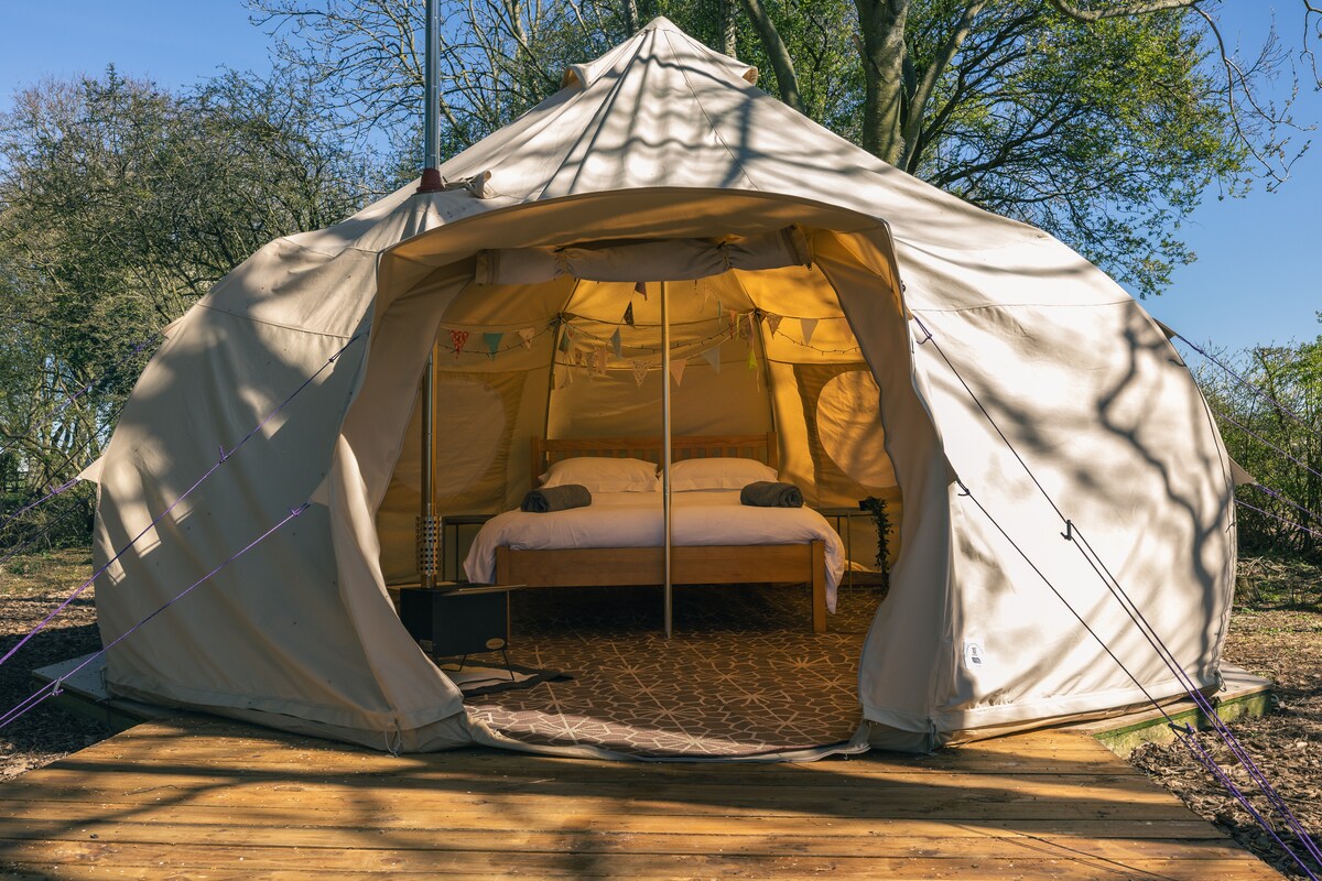 Monk's View oferece aos aventureiros amantes da natureza um glamping totalmente fora da rede (sem água, eletricidade ou instalações de cozinha) em nossa reserva natural privada, cercada pelos lagos, bosques, cisnes, gansos, veados, paz e tranquilidade. Tenha o melhor sono da sua vida em nossa tenda de sino boutique de cinco metros com a cama de casal totalmente arrumada. É super confortável! Você terá sua própria fogueira com lenha gratuita para desfrutar sob as estrelas e um adorável banheiro de compostagem só para você.