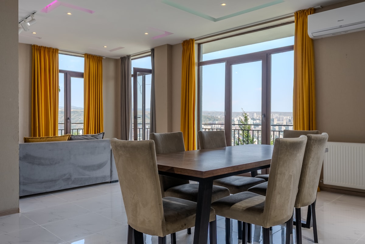 Esta bela cobertura foi concebida com luxo e conforto em mente. A casa tem vistas deslumbrantes da cidade e das montanhas com varandas e terraços em ambos os andares. Localizado no centro de Vake, é ideal para executivos, embaixadores ou famílias numerosas que procuram um apartamento de luxo de curta ou longa duração no bairro mais bonito e moderno de Tbilisi. Nós sempre nos esforçamos para oferecer a melhor experiência possível aos nossos hóspedes!