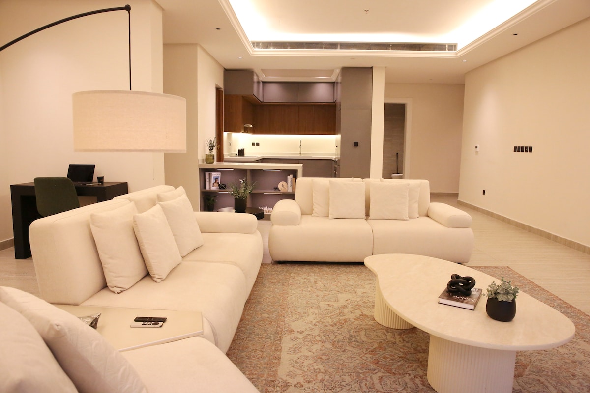 SOLID – Marco de vidro icônico | Residência de design de luxo Um apartamento de luxo refinado projetado com clareza e conforto em mente. Dispõe de duas camas king-size com qualidade de hotel, uma espaçosa área de estar com um sofá branco macio e uma TV imersiva de 85 polegadas. Inclui um espaço de trabalho dedicado, um canto de café totalmente equipado e uma cozinha moderna com todos os eletrodomésticos essenciais. Situado dentro de um impressionante edifício de vidro e mármore, oferecendo uma experiência de vida limpa, elegante e premium.