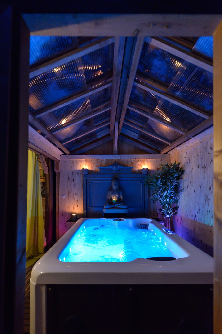 Cabane avec son spa privatif, au milieu des arbres et vue sur la vallée. Le spa est couvert et se situe juste à la porte de votre cabane, sans vis a vis pour une tranquillité parfaite et en profiter en toutes saisons. Les petits déjeuners sont compris et servis en panier à la cabane. Mini frigo, tassimo à disposition. Boissons fraîches offertes dans le mini frigo. La cabane est chauffée et dispose d'une douche à l'italienne, d'un lavabo et d'un WC. 220 euros la nuit pour 2 personnes.