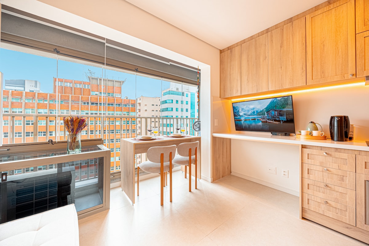 Studio moderno no Campo Belo, com rooftop, piscina, academia, sauna, ofurô e coworking. A 50m do metrô e 10 min de Congonhas. Cama box, ar-condicionado, varanda, TV e cozinha equipada. Garagem coberta incluída. Perfeito pra quem busca conforto, estilo e praticidade em SP!