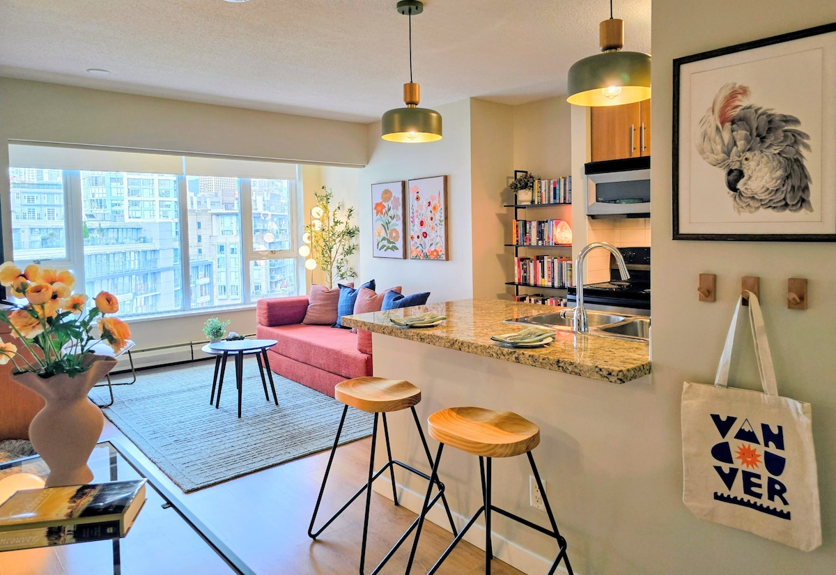 Bem-vindo ao nosso Airbnb no centro de Vancouver! Nossa acolhedora suíte de um quarto com um estúdio fica ao lado do SkyTrain, BC Place, Rogers Arena e lojas Parq Casino...Além disso, desfrute de acesso à nossa piscina coberta, academia, banheira de hidromassagem e sauna para o máximo relaxamento após um dia de exploração da cidade. Vaga de estacionamento gratuita com carregador de veículos elétricos. Estamos muito felizes em recebê-lo para uma estadia confortável e rejuvenescedora no coração da ação!