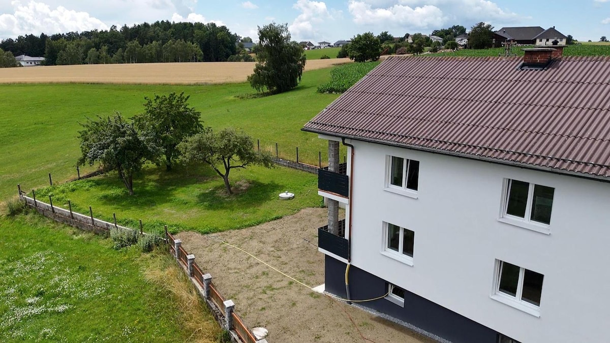 70m² apartamento individual no piso médio da nossa casa - localização muito idílica, jardim, floresta, paz e tranquilidade ao redor. Perfeito para uma viagem rápida. Chegada por transporte público possível (vamos buscá-lo na estação de ônibus - compras locais possíveis) Se você quiser vir de carro, você também pode fazer uma viagem de um dia para Cesky Krumlov, Praga, Passau, Viena ou Linz. Casais, viajantes solteiros e famílias com crianças são bem-vindos Animais de estimação permitidos.
