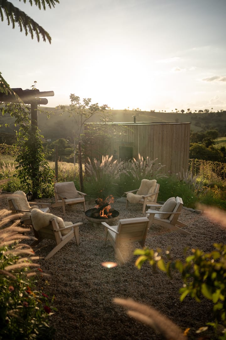 As viagens de verão ficam ainda melhores com lareira e lugar para sentar fora.