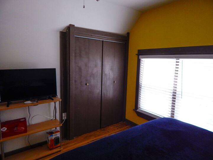 Two-story home. Private upstairs suite includes bedroom, bath, sitting room. Bedroom has queen bed, satellite tv, and closet space. Bath is shower/tub. Sitting room is a work in progress. Right now it has a small table/chairs and a mini fridge.