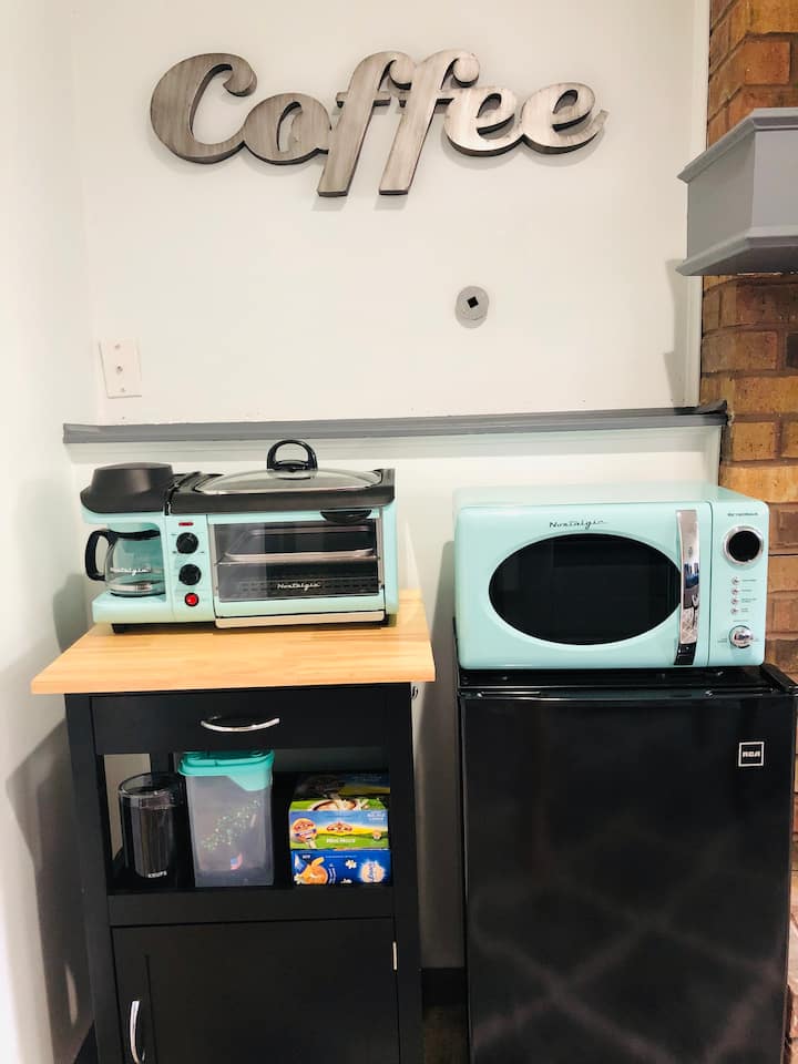 Private living area, bedroom, spa-inspired bathroom, appliance/games closet and laundry room. Small kitchenette with griddle, toaster oven, coffee maker, microwave and mini fridge. KC’s own “The Roasterie” whole coffee beans and electric grinder provided for the freshest and tastiest cup of coffee to start your day!