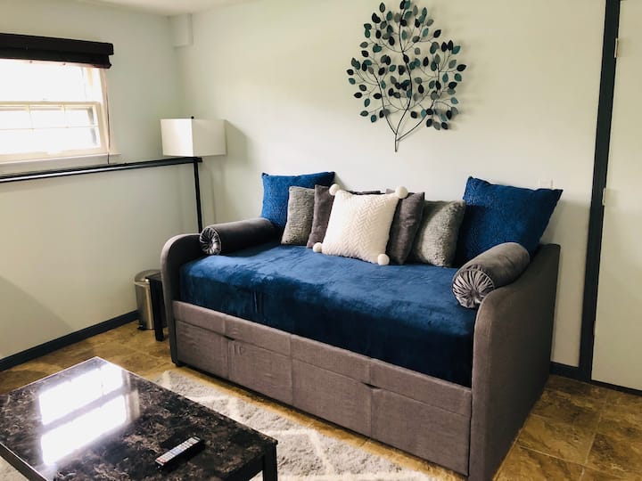 Guests will check themselves in with their unique door code that is sent the day of their reservation. Guests have access to the entire lower level of our home, excluding the garage that is being rehabbed. Guests should not attempt to enter upstairs.
