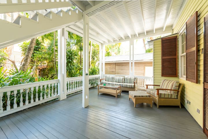 The private suite has its own entryway. Once inside, it is divided to include the bedroom, bathroom, and living area. The living area is equipped with a full kitchen. The suite includes a private covered porch and access to the hotel pool which is located just opposite the entryway. The property is a lush tropical setting with palm trees, winding paths and courtyards to relax in. It is a true Key West experience.