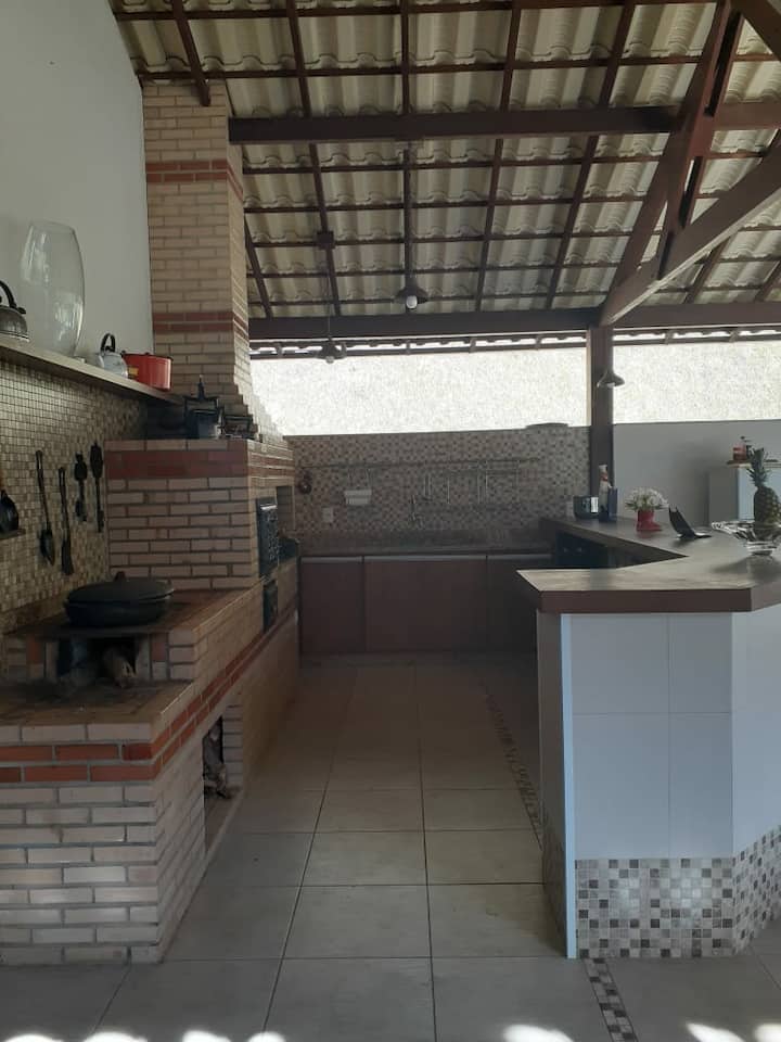 As viagens de verão ficam ainda melhores com cozinha externa, lareira, a piscina e área para churrasco.