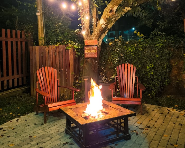 As viagens de verão ficam ainda melhores com lareira, área para refeições ao ar livre e lugar para sentar fora.