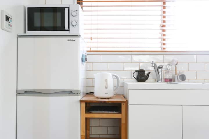 Kitchen with gas stove, microwave, refrigerator, toaster, kettle, washing & drying machine, air-conditioner, TV, toilet, shower room with bathtub, iron, ironing boad, hair dryer, tablewares