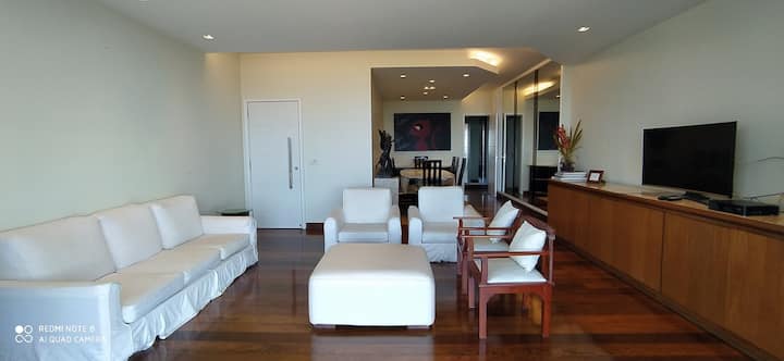 Apto 160m², vista praia, 3 quartos (1suíte), banheiro, cozinha toda equipada, roupas de cama e banho. Ideal p/ famílias.
