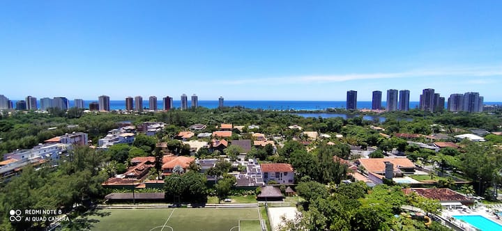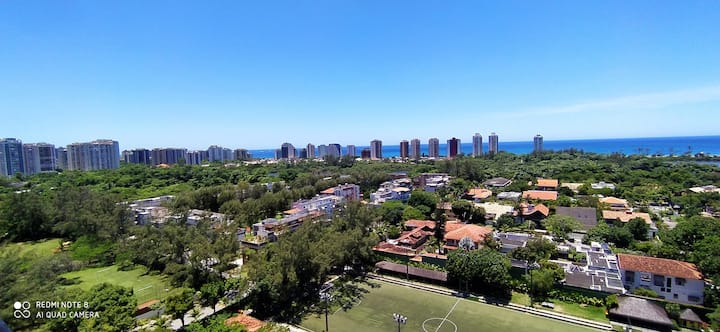 - Sala e suíte com vista para a praia da Barra da Tijuca, Reserva e area verde.