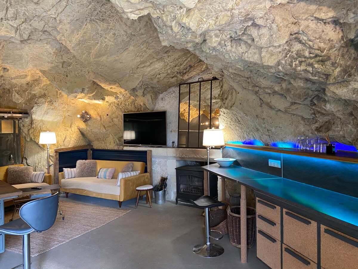 Bem-vindo ao Grotte du Moulin! Este loft natural é rebaixado em um monte de calcário e vai surpreendê-lo com sua transparência. É composto por uma grande cozinha aberta para a sala de estar e um quarto com casa de banho separada por uma porta de garagem deslizante. No quarto, você tem uma cama de casal (160 cm) e na sala de estar uma cama de solteiro (90 cm) com um sofá não conversível que pode ser usado como uma pequena cama de solteiro.