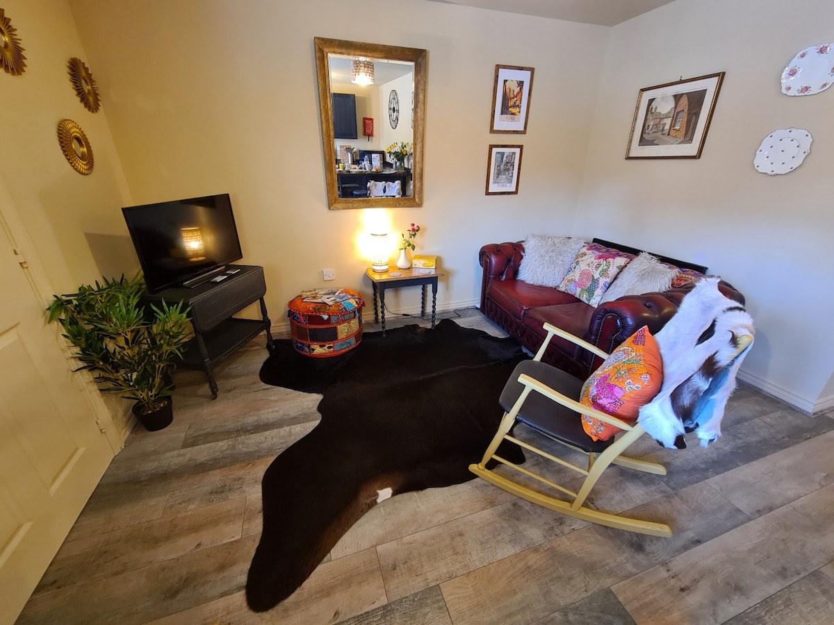 ENTRADA PRIVADA Com área de estar externa. Adorável suíte independente. Um quarto duplo com camas de solteiro também oferece duas cadeiras confortáveis e Smart TV. Banheiro privativo e área compacta separada (cozinha pequena), para preparar café da manhã leve com torradeira, micro-ondas,chaleira, geladeira, congelador e fritadeira a ar. Chá e café, manteiga de pão de cereais fornecida. Estacionamento gratuito e Wi-Fi. Supermercado COOPERATIVO a cinco minutos a pé. Pub/restaurante aconchegante e adequado para cães ao lado de Coop.