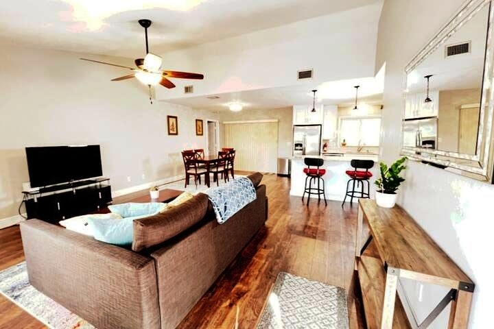 Esta pequena casa super fofa recém-construída é de um andar, conceito aberto. Móveis e eletrodomésticos novos. Estacionamento privativo e cercado no quintal. Cama 🛏️ Queen 🛏️ Sofá-cama de tamanho completo. 📺 2 TVs de tela plana grandes. (Sala de estar e quarto) 🧑🍳Cozinha grande com tudo o que você precisa para cozinhar. - Máquina de💦 lavar e secadora 🚿 banheiro com chuveiro 🍽️ Máquina de lavar loiça. 😴Toalhas e roupas de cama brancas 🧊Máquina de gelo 🧴 Shampoo, condicionador, sabonete líquido