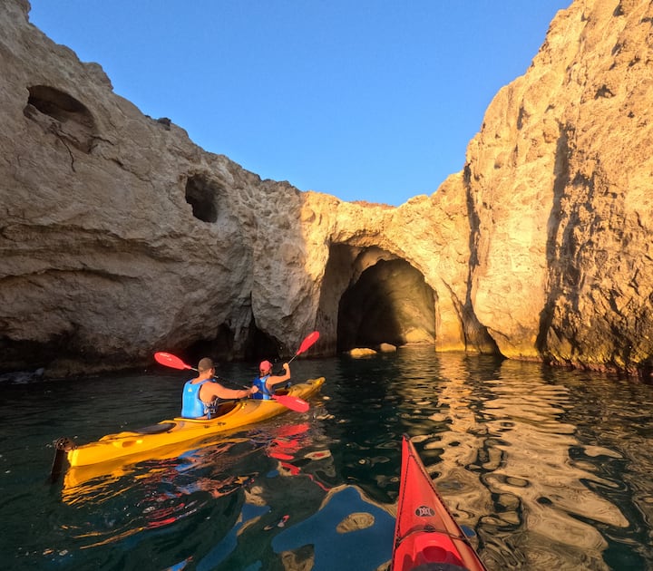Passeio romântico de caiaque no mar para explorar as grutas de Papafragas