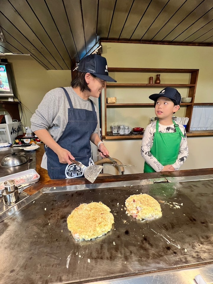 Vamos experimentar juntos como fazer um autêntico okonomiyaki em uma loja de okonomiyaki de longa data em Osaka!