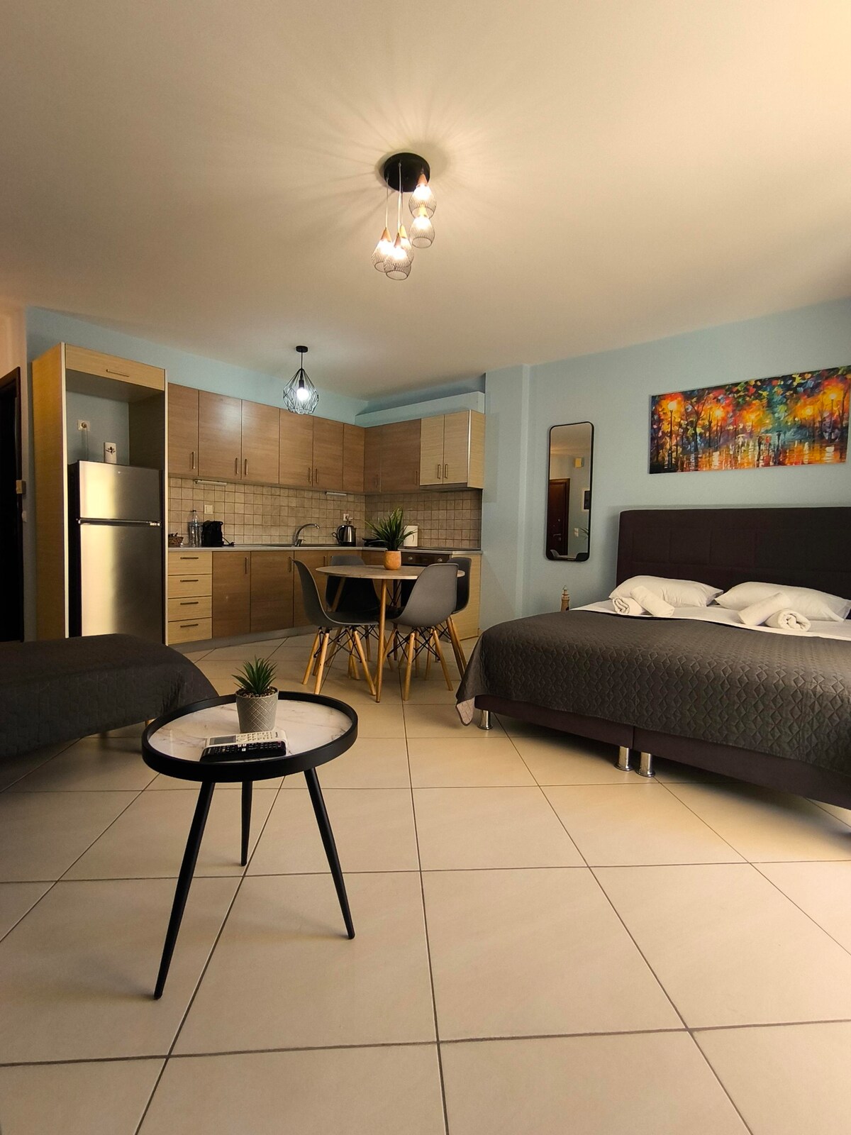 The apartment is located in a central part of the city, with all kinds of shops around but mostly very close to organized beaches with beach bars and tavernas. The nearest is "Kourendi" (at a distance of 150 m.) Τhe Bus station is located 30 m. away from the building! Come....and you will enjoy a wonderful experience of staying in a safe, clean, bright and positive place!