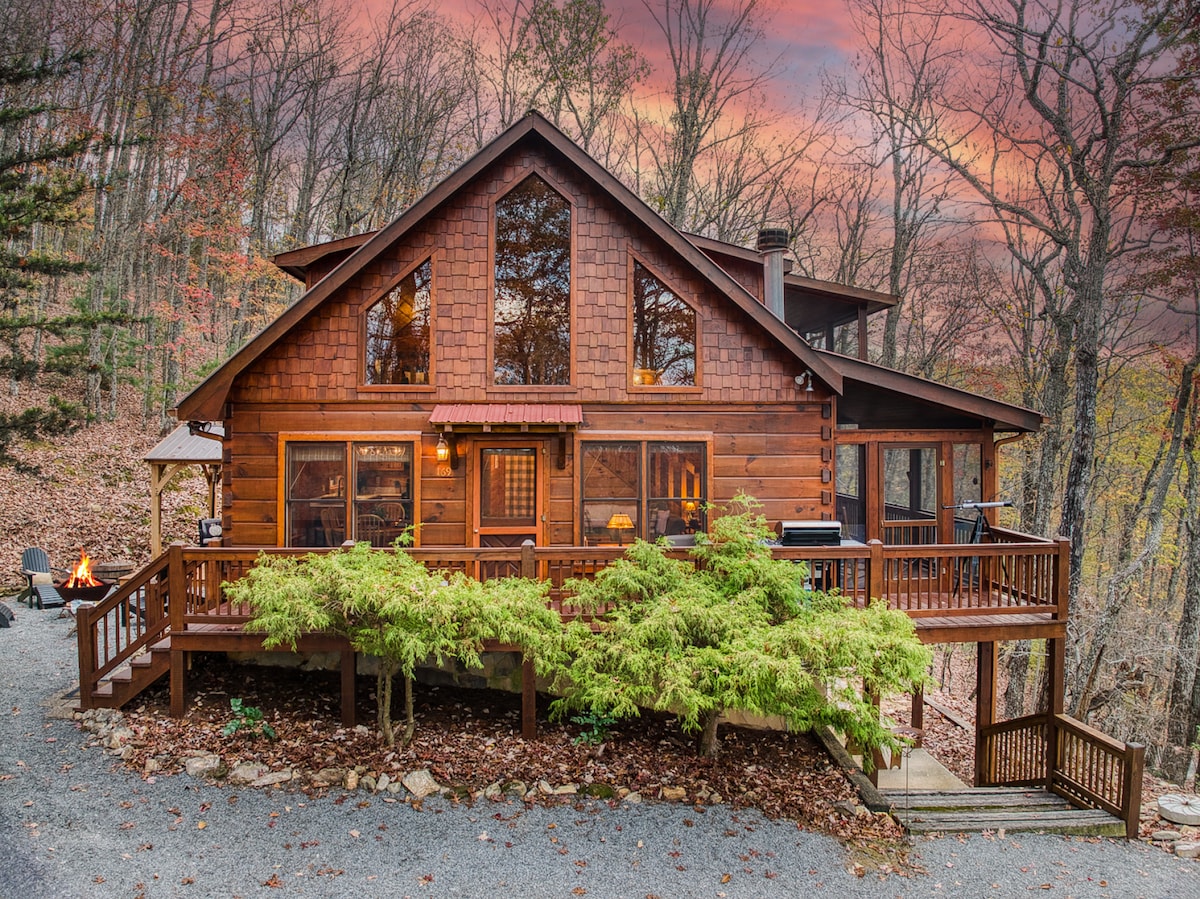 Nota: Novas fotos em breve. Cabana luxuosa e um pedaço do paraíso. 20 minutos para Blue Ridge Cama king no andar principal com uma cama queen no loft. Banheiro privativo em cada andar. Tetos altos. Lindamente decorado. Grande tela na varanda com balanço de cama. Banheira de hidromassagem em um ambiente privado em um deck construído sobre um pequeno riacho. Maravilhosa área de lareira. Tudo é privativo. Você não vai querer perder isso