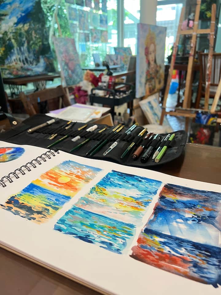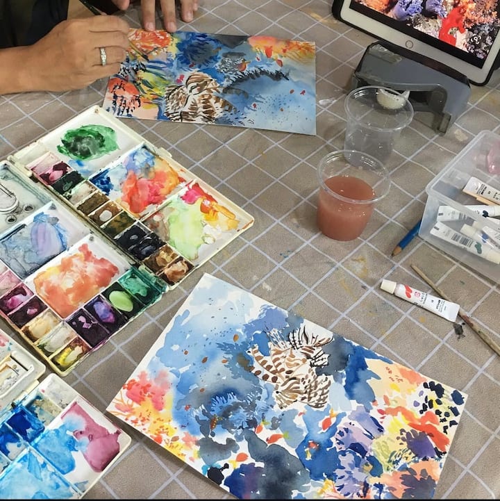 Pintura em aquarela marinha com artista de Samui