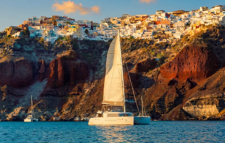Passeio de catamarã dourado em Santorini com churrasco e bebidas