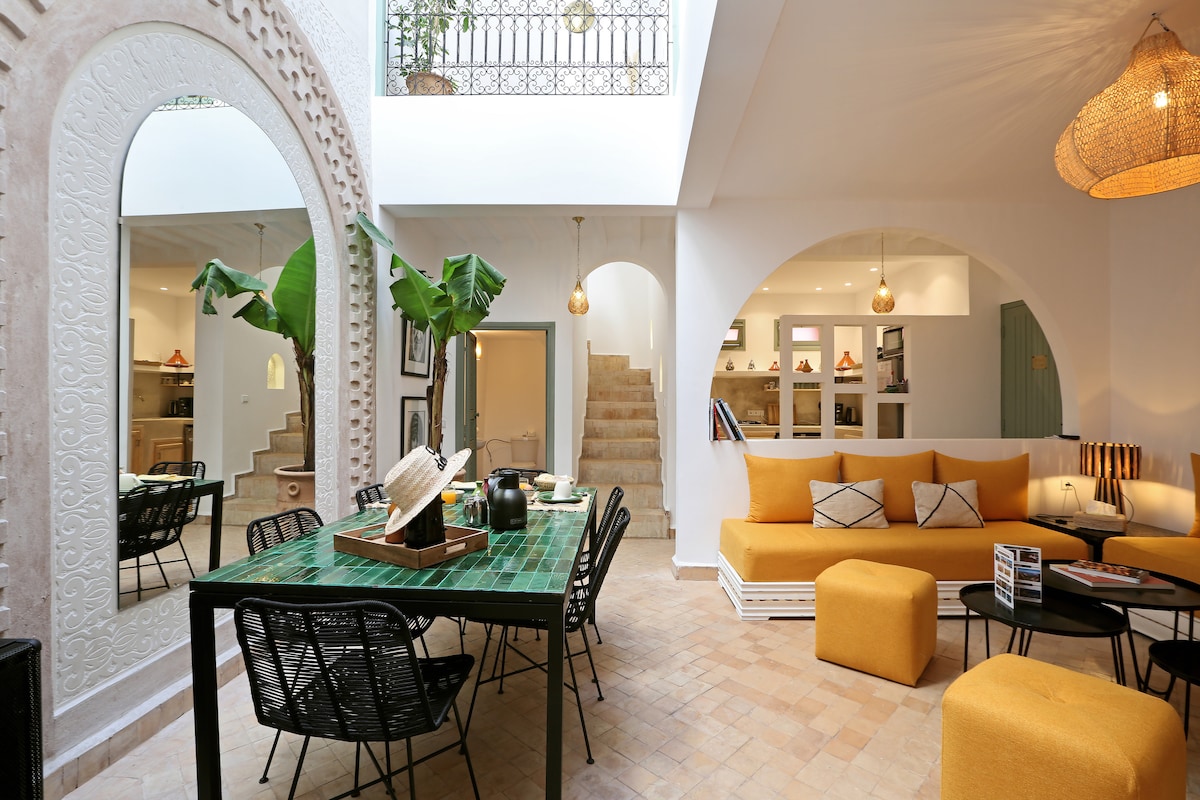 Bienvenue dans notre havre de paix, notre maison rénovée avec passion en 2021, située au cœur du quartier de la Kasbah, à 2 pas des Tombeaux Saadiens, d'un petit marché quotidien de produits frais et à moins de 10 minutes à Pied de la place Jemaa El Fna et des souks colorés. Le Riad se loue en exclusivité, il est entièrement privatisé pour vous. Mélange de tradition et de modernité , il est idéal pour passer d'excellents moments en famille , entre amis ou en couple .