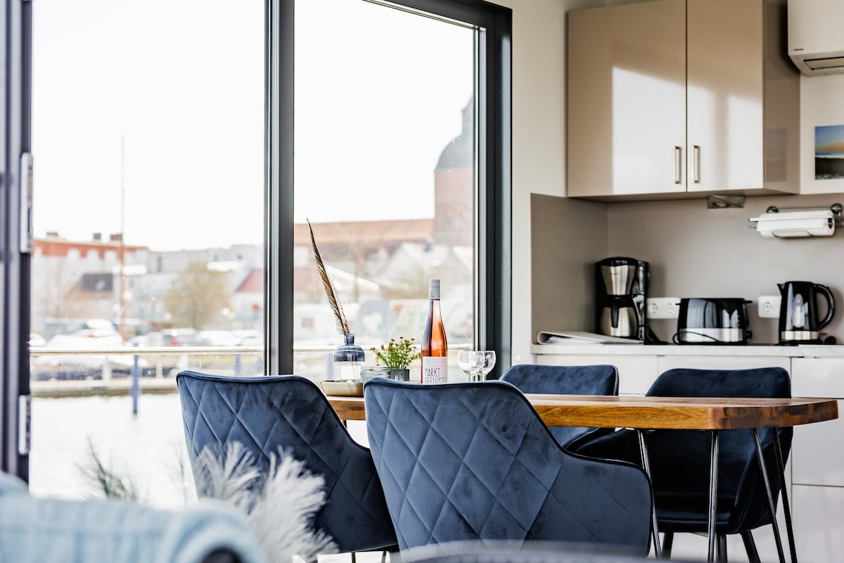 Nossa casa flutuante, que fica firmemente na marina, torna possível um feriado especial diretamente na água. Aproveite a combinação de casa flutuante e apartamento de férias confortável. Seja na rede ou no terraço, o relaxamento espera por você aqui. Você tem uma vista maravilhosa sobre o porto, em Rügen e Stralsund. O porto é localizado diretamente na ciclovia do Mar Báltico. Até 2 CÃES são PERMITIDOS e gratuitos, outros animais de estimação infelizmente têm que ficar em casa