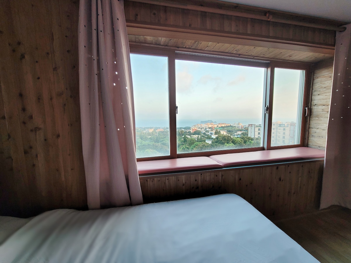 Olá. Está localizado em um penhasco no centro de Seogwipo, por isso tem uma vista perfeita para o mar com vista permanente. É do tipo um quarto, mas ao contrário de outros tipos de acomodações de um quarto, oferece uma área ampla, O quarto, a sala e a cozinha estão completamente separados, tornando-o um movimento eficiente. Gostaríamos de fornecer café da manhã em um espaço maravilhoso que possui a melhor vista para o mar, juntamente com uma piscina compartilhada para lhe dar conforto e conforto em sua viagem a Jeju.