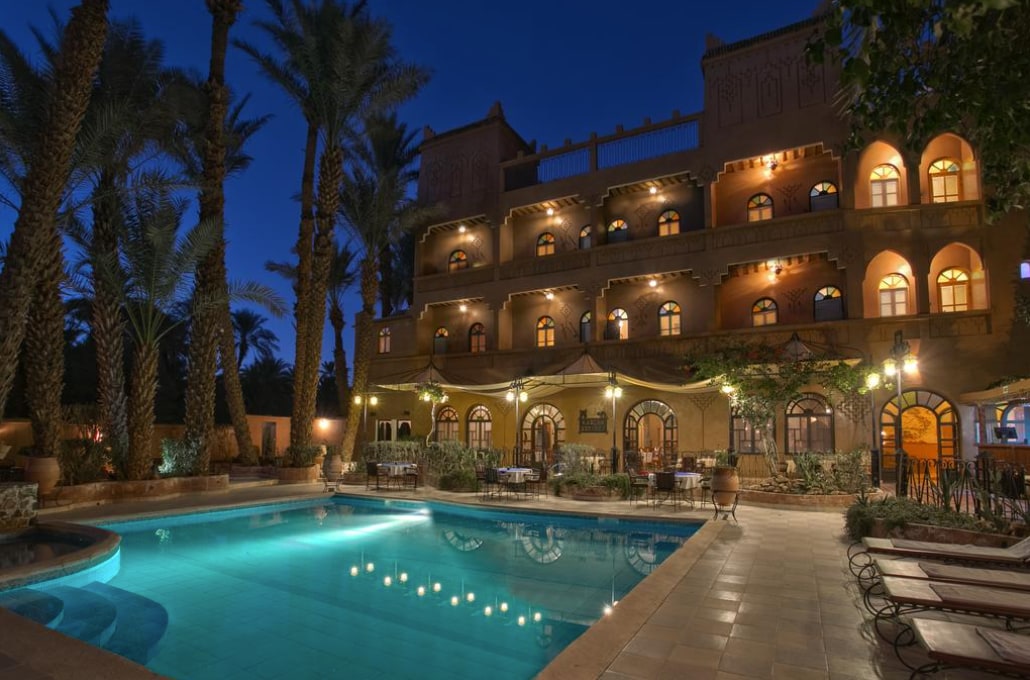 Nomad palace hotel Located in the heart of the desert, 7 km from Merzouga, this hotel offers an outdoor swimming pool with bar service and air-conditioned rooms. The rooms at the Nomad Palace have traditional Moroccan décor and a bathroom decorated with mosaics. They enjoy a view of the sand dunes that surround the property. Breakfast is served daily at Nomad Palace and guests can sample traditional Moroccan dishes such as tajines for other meals. You can relax on the hotel's terrace