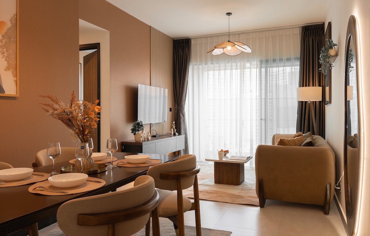 O apartamento é lindamente projetado em estilo Wabi Sabi localizado no edifício D1Mension Residences, centro de apartamentos do Distrito 1, estilo artístico, comodidades de resort de alta classe, piscina especial na cobertura _ piscina de spa _ sala de sauna, academia_ showroom, escritório privado, lago de peixes no jardim, pizza 4' no saguão, área de churrasco no jardim, área de recreação infantil, sala de espera espaçosa, todas as janelas e varandas do quarto são arejadas, únicas, luxuosas, apartamento elegante