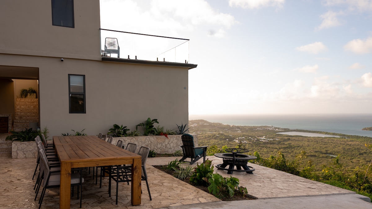 OASIS COM VISTA PARA O MAR DO CARIBE Esta vila de tirar o fôlego será seu paraíso pessoal! Mini-resort meticulosamente decorado com todos os toques de design de alta qualidade que você gosta. Se você está se esticando na piscina, olhando para as estrelas no jardim perto da mesa de fogo, você ficará feliz por ter reservado suas férias aqui! Todos os 3 quartos oferecem banheiros privativos A poucos minutos das MELHORES praias, restaurantes e lojas de St Croix. A localização única destas propriedades oferece decks e piscina com vistas deslumbrantes para o nascer e pôr do sol.