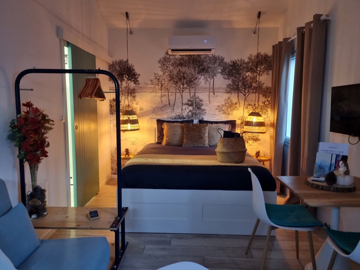 Desfrute do ar do mar neste estúdio luminoso e lindamente decorado de 21m2, incluindo cozinha equipada, chuveiro e área de estar. Você desfrutará de seu terraço privado equipado com móveis de jardim e churrasqueira. Estacionamento + 2 mountain bikes disponíveis. A praia de La Davière e suas dunas estão a 900 m da acomodação. Restaurante a 50 m de distância, aberto o ano todo. Supérette Les Tonnelles a 1,5 km de distância, aberto no verão. Centre Ville St-Jean-de-Monts: 5 min de carro/15 min de bicicleta O mesmo que Notre-Dame-de-Monts
