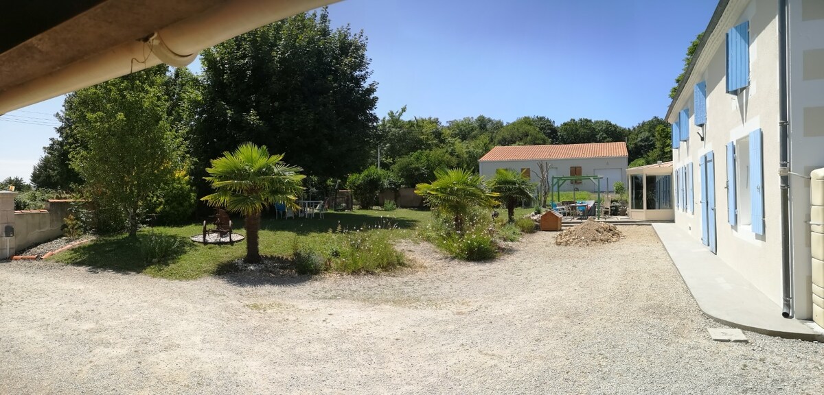 Relaxe neste alojamento tranquilo e elegante. Você encontrará todo o conforto para recarregar as baterias. Você será recebido por Valérie e sua pequena Border Collie Tina, que virá pedir carinho. Você pode passear a pé ou de bicicleta em nossa encantadora vila. Nossa vila fica a 10 minutos de Saint-Jean-d'Angely, 30 minutos de Niort e sainte, e 1h do mar Royan, Fouras ou La Rochelle. Venha nos visitar.
