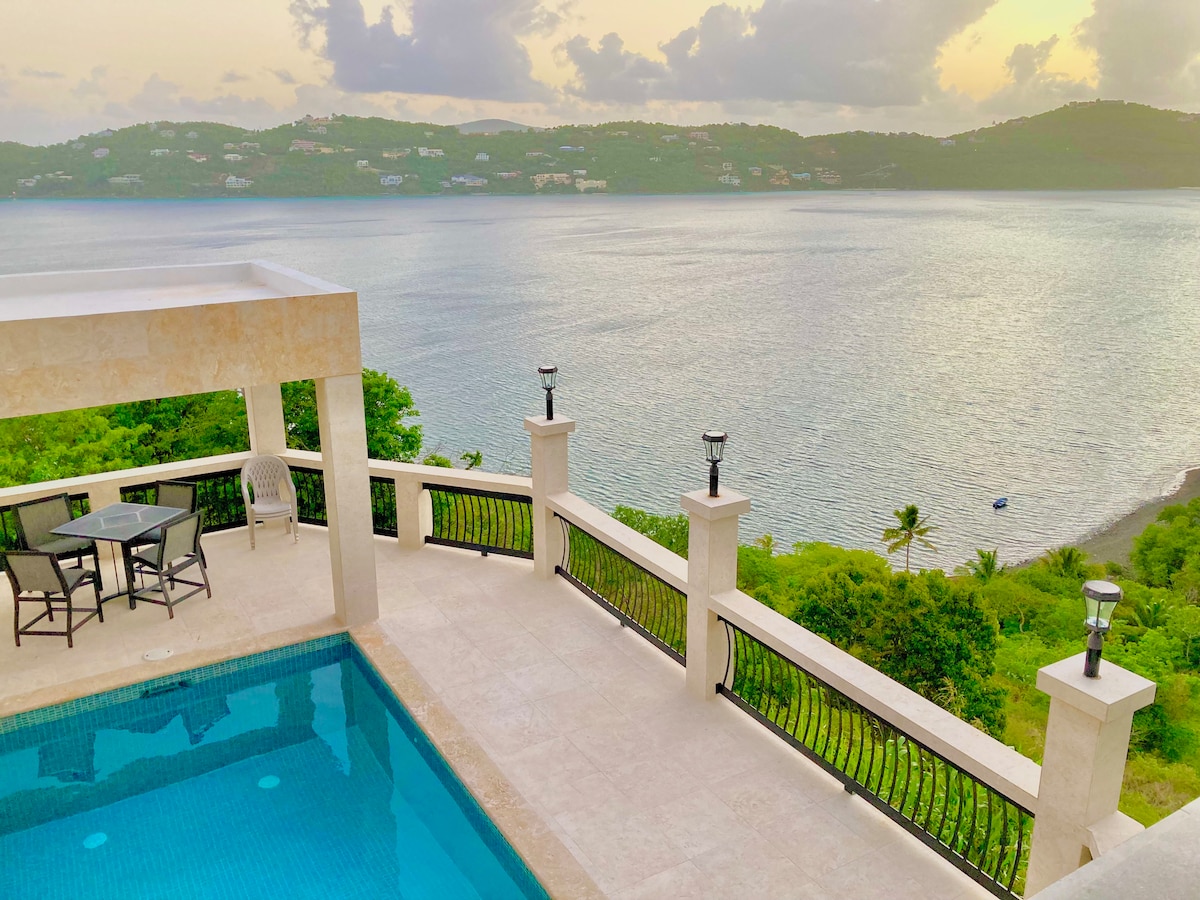Bem-vindo ao CalypsoBlu, uma vila isolada em St. Thomas com vistas deslumbrantes para o Caribe. - Três quartos com ar condicionado, cada um com entradas privadas - Grande sala espaçosa com áreas de estar e jantar - Varanda coberta com vista para a piscina e deck ao sol - Deck da piscina com cadeiras, mesa e grelha - Linda passarela de jardim e corredor para relaxamento - Serviço de concierge gratuito para planejamento de viagem personalizado - Assista ao pôr do sol e aos navios de cruzeiro da sua vila