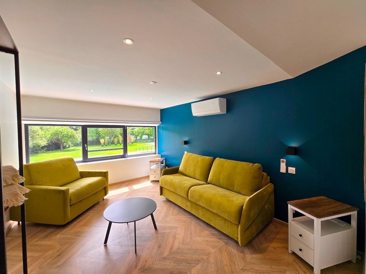 Nós fornecemos um espaço independente de 37 m2 em nossa casa. Consiste em uma entrada espaçosa que serve um banheiro com chuveiro, banheiros separados e a sala de estar que lhe dá acesso à vista deslumbrante e tranquila da zona rural circundante. Uma cozinha pequena permitirá que você coma. Cama 140/190 tipo Futon. Roupas de cama e toalhas de mão estão disponíveis.